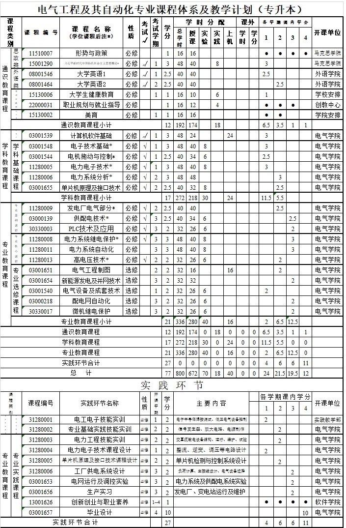 电工电子技能实训、电力工程技能实训、电力电子技术课程设计、单片机原理及接口技术课程设计、工厂供电系统设计、电网运行及调控实验、生产实习、毕业设计。