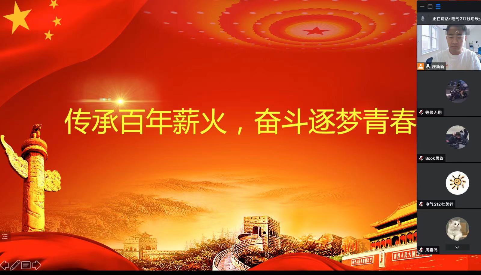 辅导员庄新新老师面向员工党员、主要员工干部、入党积极分子开展“传承百年薪火。奋斗逐梦青春”主题党课,希望同学们争做埋头苦干的实干家,强化奋斗精神,不怕吃苦,不惧风浪,更自觉更坚决紧跟党投身具有许多新时代特点的伟大斗争;希望同学们不断培养对广大劳动人民的朴素情感,扎根基层,深入基层,主动了解和关心周围同学的所思所盼,自觉走与群众相结合的成长道路。